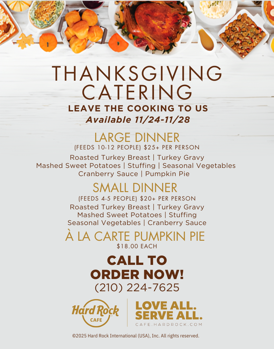 Call now to enjoy Hard Rock Cafe San Antonio's seasonal specials, delivered right to your door! Thanksgiving specials available only from 11/24-11/28.