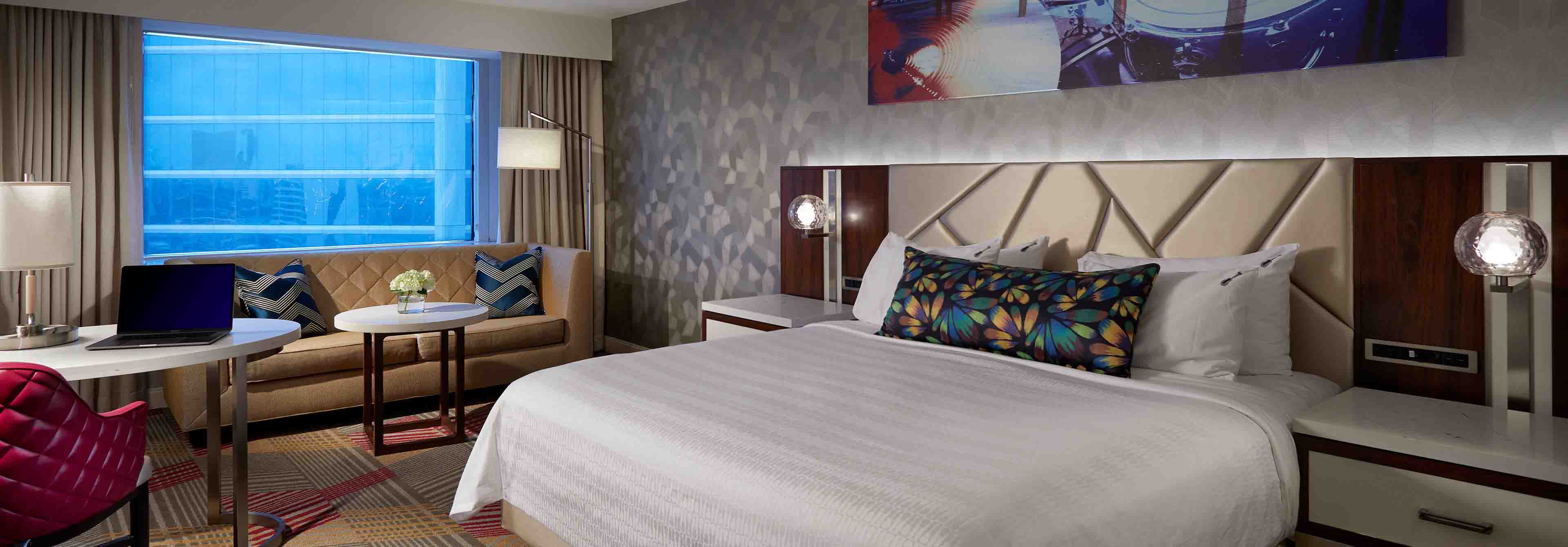 This nicely appointed hotel room features either one king or two queen pillow-top mattresses with Sleep Like a Rock bedding, which includes delightful foam pillows and supple cotton sheets and duvets. The bathrooms are equipped with our signature Rock Spa bathroom products, including hand-cut soap, cotton towels, hair dryer and vanity mirror. Each room also features a 55-inch mounted flat-screen TV, refrigerator, couch, alarm clock, self-set combination room safe and coffee maker, along with an iron and ironing board