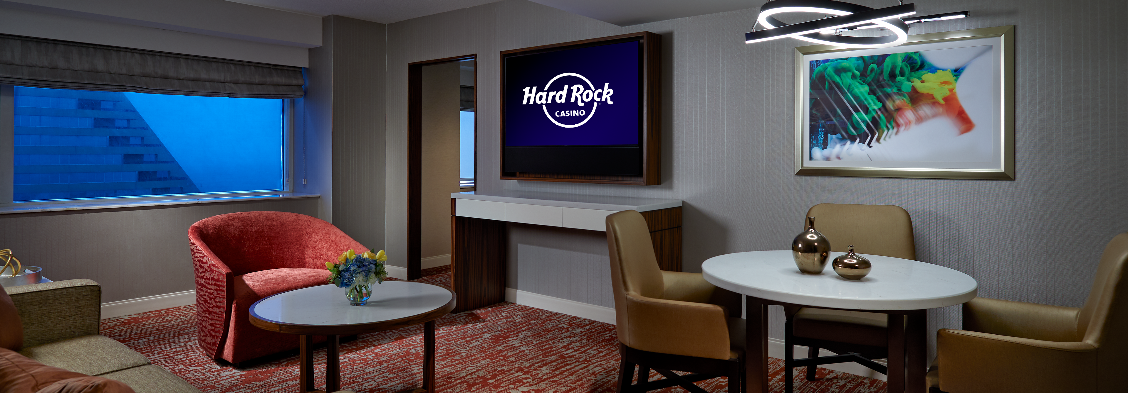 This suite features a master bedroom and a separate living room with a four-person dining area and bar. -
