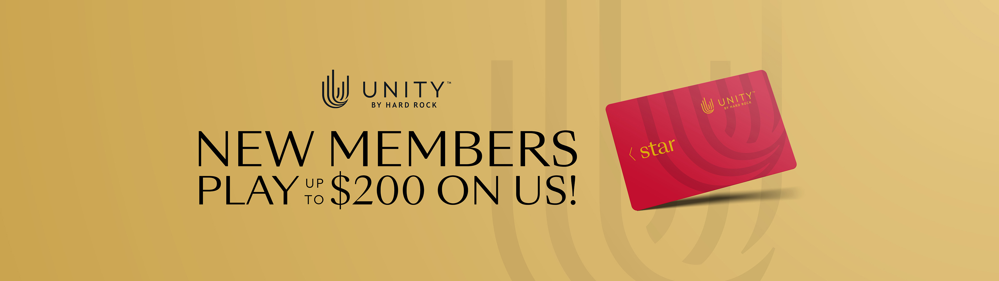 *Offer only available to new Unity by Hard Rock members. Total actual loss up to $200 in Free Play. Offer paid in two each equal to 50% of your total loss amount redeemable over two visits. Offer is up to $200 in Free Play only. First Free Play offer will be auto loaded onto your account within 7-10 days of playing at your favorite slot machine. Only actual slot losses on same day of enrollment with your Unity by Hard Rock card will be included in total slot loss amount.
