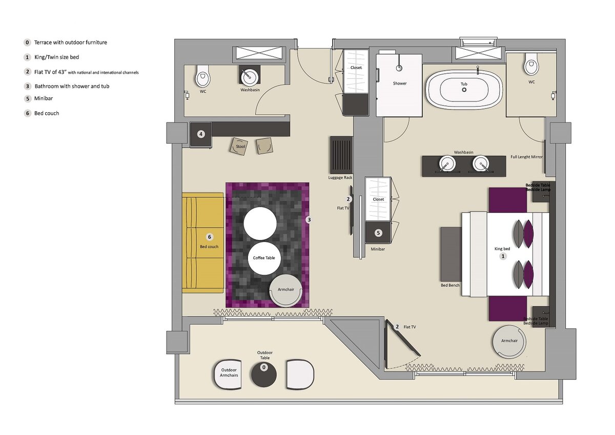 50 m² studio, equipped with designer furniture, with furnished terrace with frontal sea view . With designer furniture, a bedroom to die for after a long day of adventures, a living room to re-lax in and the most glamourous bathroom with a sensory shower, this is the suite you need for an unforgettable experience. You will love its fabulous whirlpool bath!