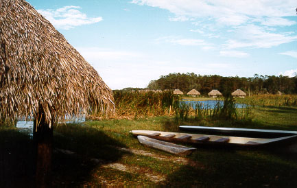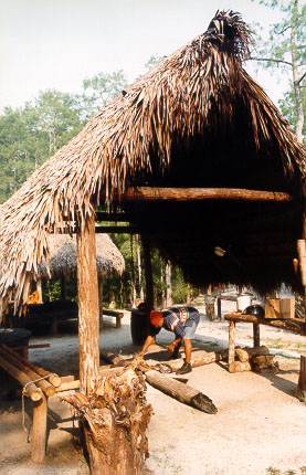 "Chickee" is the word Seminoles use for "house." The first Seminoles to live in North Florida are known to have constructed log cabin-type homes, some two stories tall, with sleeping quarters upstairs. The chickee style of architecture - palmetto thatch over a cypress log frame - was born during the early 1800s when Seminole Indians, pursued by U.S. troops, needed fast, disposable shelter while on the run. Though indigenous peoples in other parts of North and South America have developed similar dwellings, it is generally agreed that the Seminole Indian technique and product are far superior.